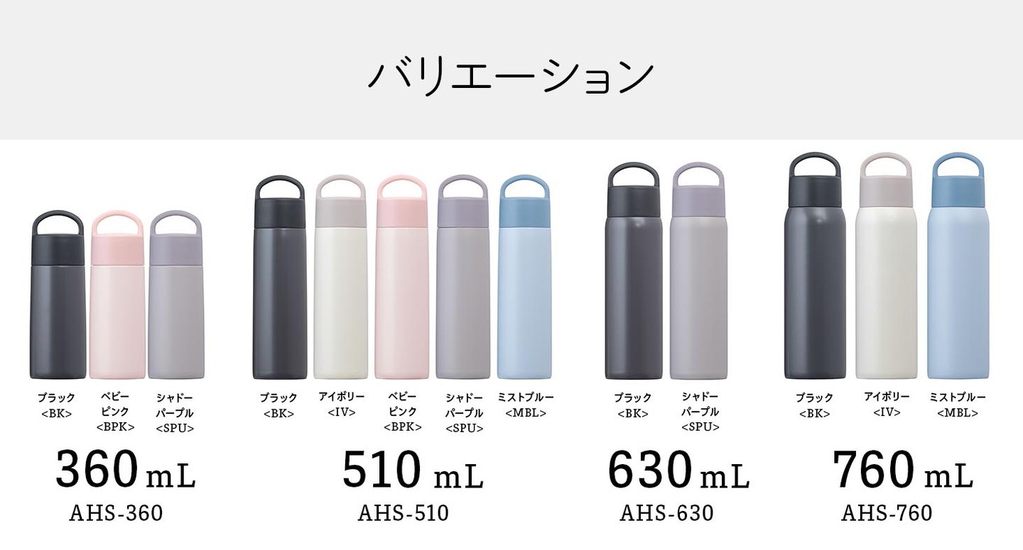 使いやすさとデザイン性を両立した、日常に寄り添うボトルシリーズです。ミニマルなフォルムは、シーンやライフスタイルを選ばず自然と暮らしに溶け込みます。必要な機能をしっかりと備えた、毎日にちょうどいいスタンダードを目指しました。(左からAWR/ASR/AHS)
