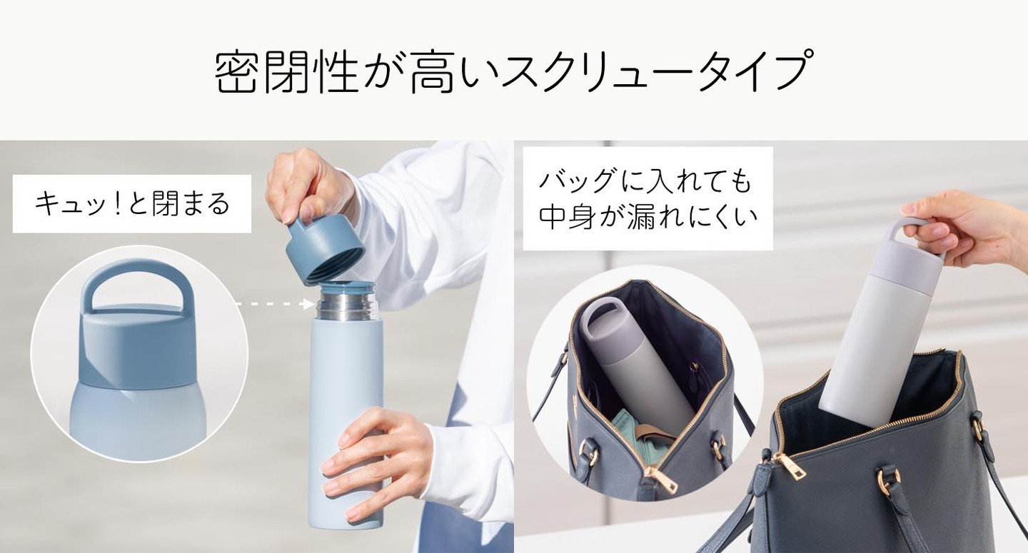 密閉性が高いスクリュータイプ。バッグの中でも漏れにくく、気兼ねなく持ち運べる使いやすさにこだわった設計です。