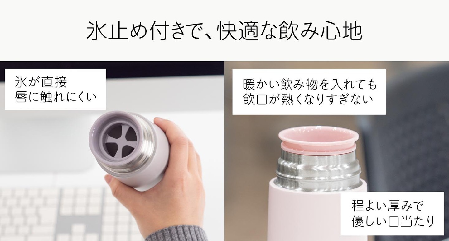 氷止め付きの飲み口で熱伝導しにくい素材を採用しており、氷が直接唇に触れにくいだけでなく、温かい飲み物でも口元が熱くなりすぎません。唇が直接ステンレスにあたらず、程よい厚みで優しい口当たりです。4方向の飲み口穴によって、向きを気にせずどの角度からでもスムーズに飲めます。