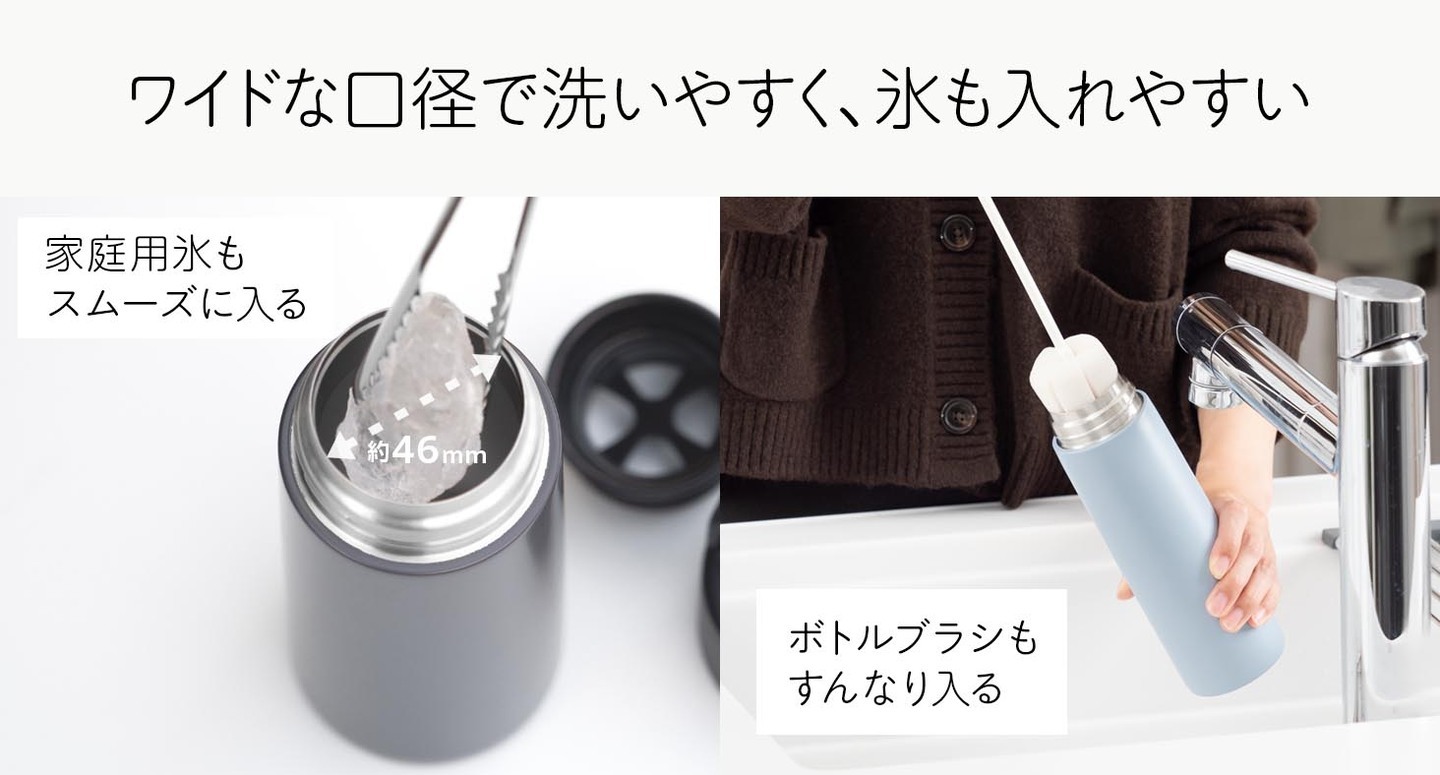 ボトルブラシも入り、家庭用の氷もラクラク入る46mmのワイドな口径です。日々のお手入れや準備がさりげなく楽になる、使う人に寄り添った設計です。