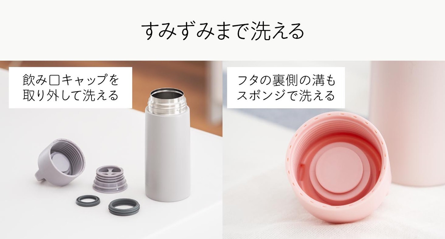 飲み口キャップが取り外せる設計で、本体・フタ・パッキンの各パーツを細部までお手入れ可能。フタの裏側の溝もスポンジが届くためしっかり洗えます。