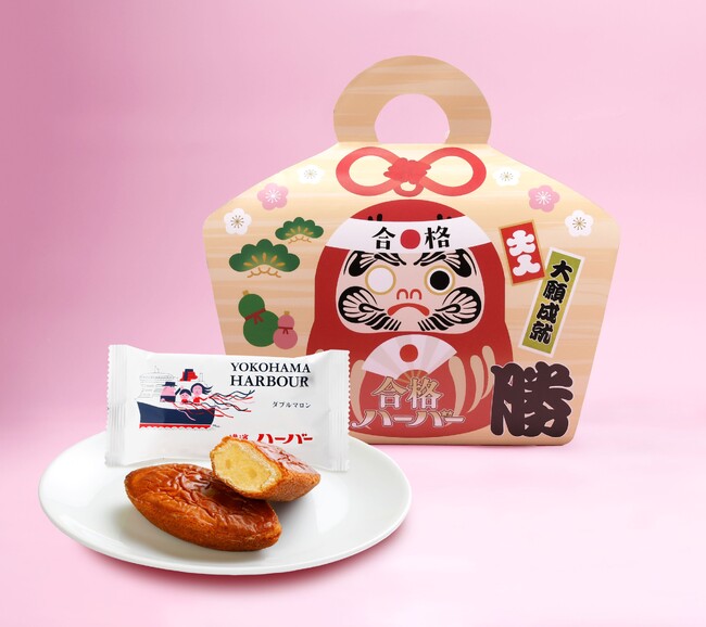 本商品は毎年ご好評をいただいている季節限定商品です。今年は新たに「合格ステッカー」を封入いたしました。パッケージには、メッセージを入れられる絵馬とだるまのモチーフをデザイン。頑張る受験生の皆様をそっと見守り、応援したいという想いを込めております。中身は、港・ヨコハマの船をイメージし伝統の製法で焼き上げた贅沢なマロンケーキ「横濱ハーバー ダブルマロン」の5個入です。