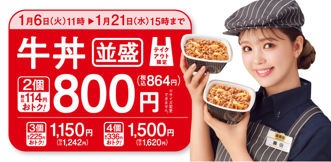 内容:テイクアウトの牛丼並盛を2個、3個、4個購入時にキャンペーン価格で提供します。