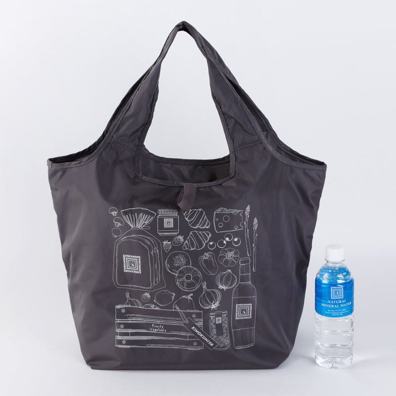 バッグの裏面には、イギリスパンやあんぱん、フルーツや野菜、ワインなど、紀ノ国屋の人気商品をモチーフにしたイラストをあしらいました。見た目にも楽しく、使うたびにちょっと嬉しくなるデザインです。