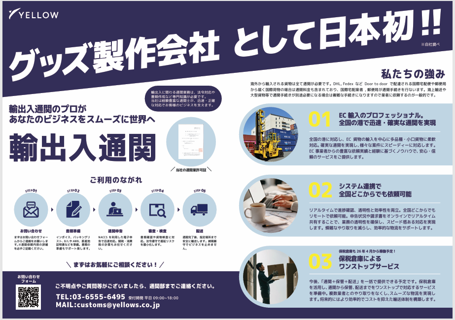 イエロー株式会社では、必要書類の準備から通関申告、税関対応まで一貫してサポートします!