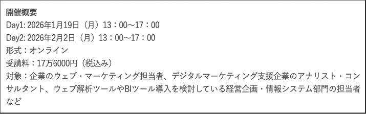 - AIとデータで事業を加速する次世代マーケターへ――GA4×BigQuery×GTMを統合活用する認定講座、1月ご案内01/07 10:00
