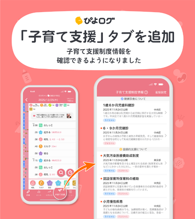 育児記録アプリ「ぴよログ」は、国が整備する「子育て支援制度レジストリ」との連携を開始し、全国の自治体が提供する子育て支援制度情報のアプリ内での提供を順次開始します。本連携により、子育て世帯が必要な制度情報を“最適なタイミング”で受け取れる環境が整い、支援制度の“知らなかった”“申請を忘れていた”といった課題の解消を目指します。