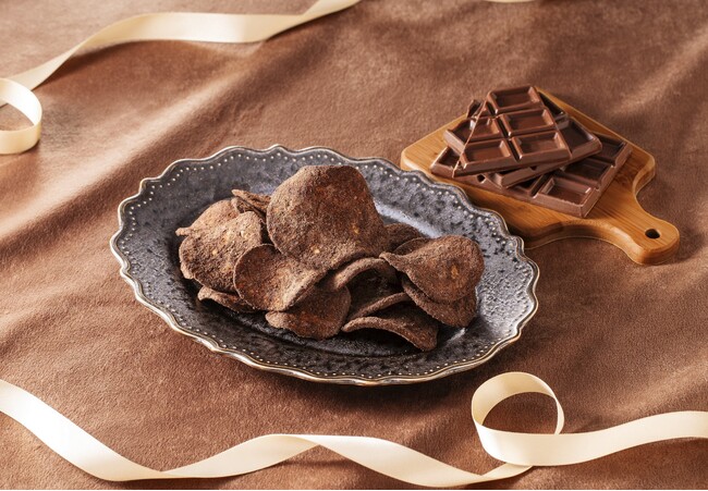 「おさつどきっ」ショップで提供される商品は、通常の「おさつどきっ」と比較して約1.5倍の厚切りに仕上げています。この厚切りによるボリューム感のあるしっかりとした食感は、噛むほどにさつまいも本来のおいしさを味わえます。「プレミアムショコラ味」では、そんなさつまいもの味を一層引き立てるチョコレートを厳選し使用。ここでしか出会えない、特別な一枚をお楽しみ頂けます。