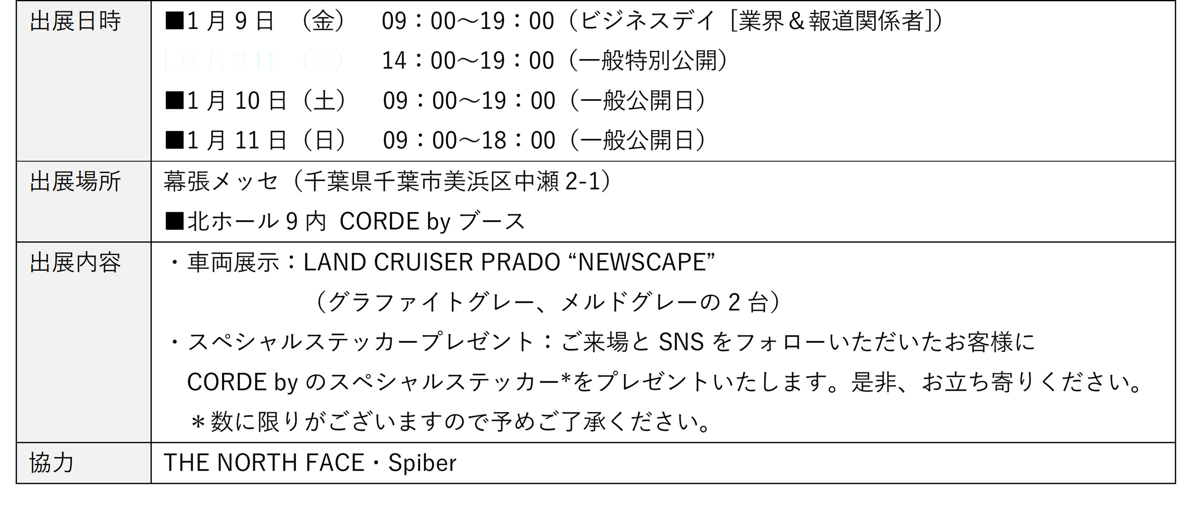 2026年1月9日(金)~11日(日)に幕張メッセで開催される「TOKYO AUTO SALON 2026」に2色のボディカラーを出展いたします。東京エリアでの2モデル同時展示は初となりますので、この機会にぜひお立ち寄りください。[画像6: https://prcdn.freetls.fastly.net/release_image/58285/91/58285-91-266d43fa8fa13346945df3051c212733-3900x1716.png?width=536&quality=85%2C75&format=jpeg&auto=webp&fit=bounds&bg-color=fff ]