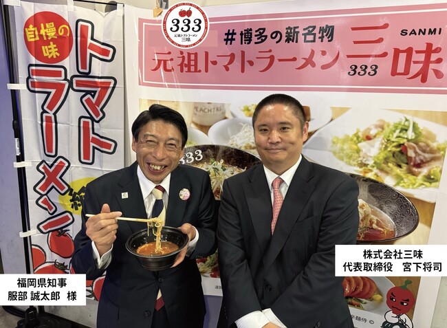 三味(333)の元祖トマトラーメンをご実食いただき福岡県の繁栄を語り合った県知事の服部誠太郎様と弊社代表の宮下将司