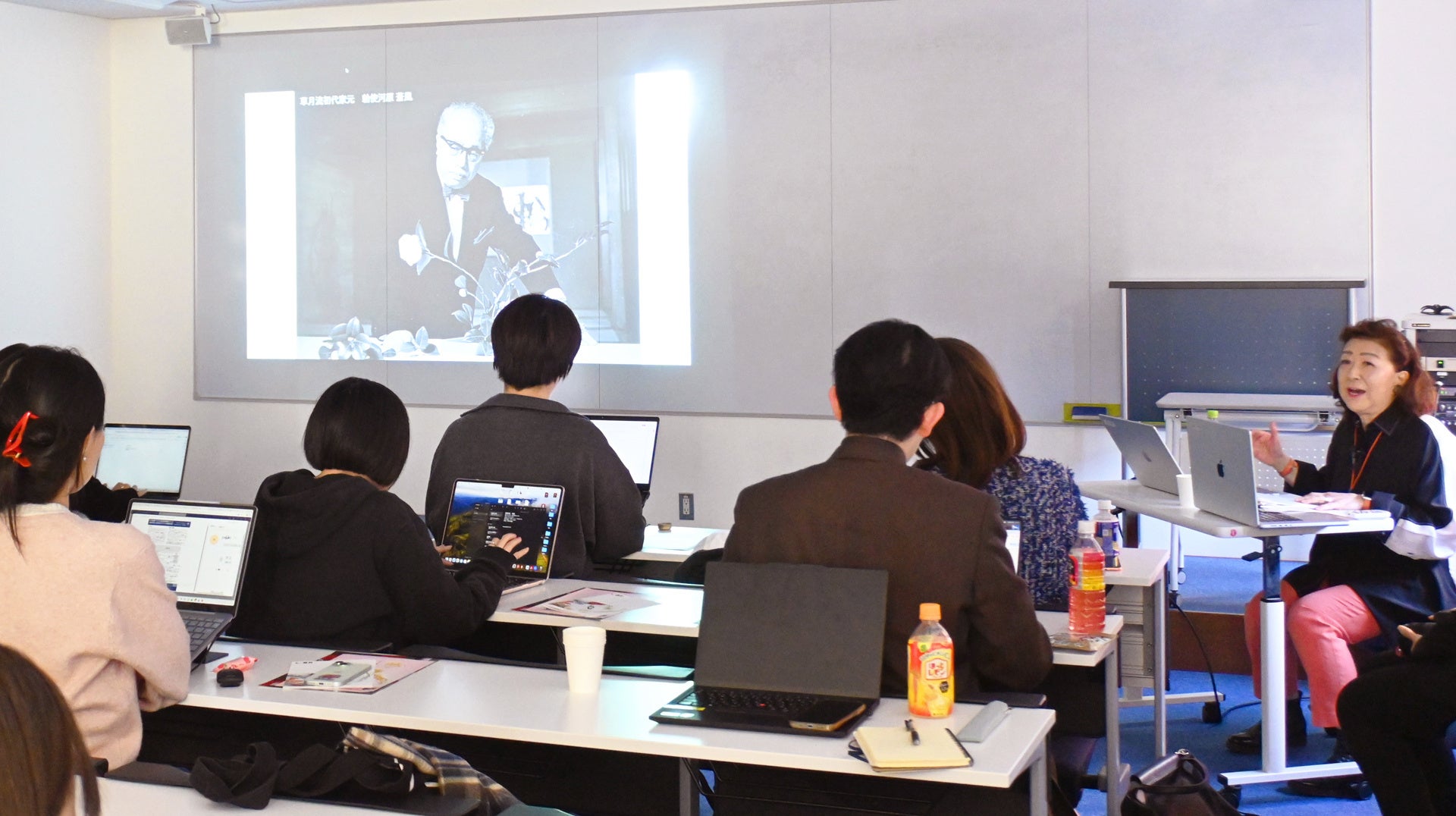 ビジネスの第一線で活躍する受講生を前に、草月流が長年大切にしてきた創造の姿勢や、時代とともに変化してきた歩みを、実演とともに紹介する講義となりました。