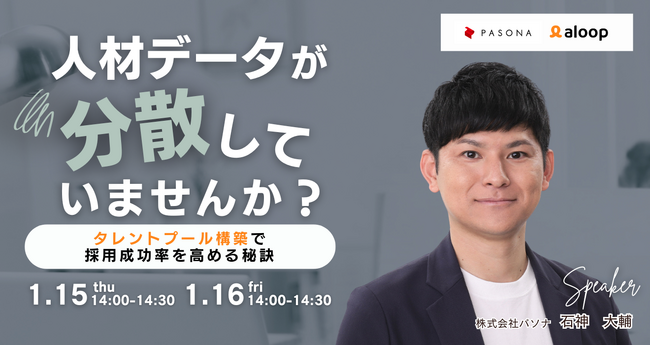 株式会社パソナ(本社:東京都千代田区、代表取締役社長 中尾慎太郎)は、人事・採用ご担当者様へ向けたを対象にしたウェビナー、「人材データが分散していませんか?タレントプール構築で採用成功率を高める秘訣」を1月15日(木)、16日(金)に開催いたします。