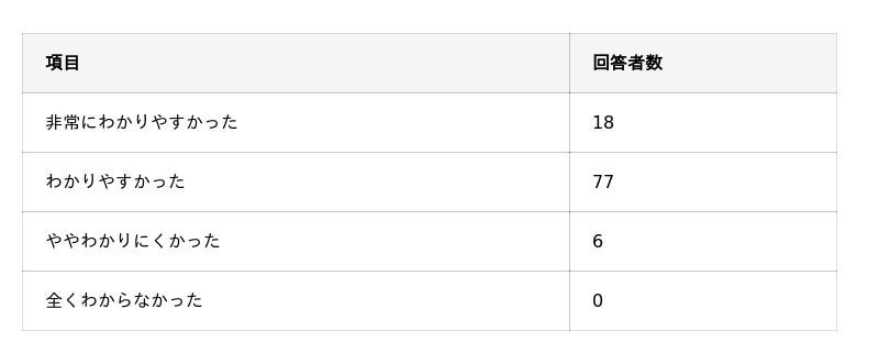 - 作業中に質問しやすい雰囲気だったと感じた人は77%で、質問できる雰囲気ではなかったと感じる人もいる。