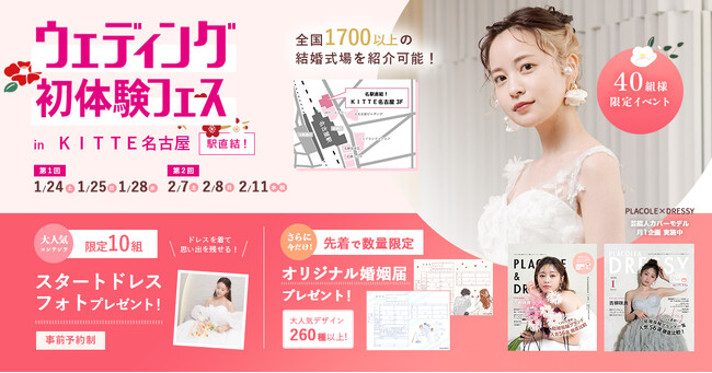 「PLACOLE & DRESSY」ブランドを展開する、冒険社プラコレ(本社:神奈川県鎌倉市、代表取締役CEO:武藤功樹)は、名古屋駅直結商業施設KITTE名古屋3F、ウェディングのテーマパークカフェ"DRESSY CAFE"にて、1/24(土)25(日)28(水)の3日間限定で、これから結婚式をお考えのカップル様に向けた、個室相談やウェディングドレス試着ができる豪華特典付きのウェディング初体験フェスを開催いたします。(40組様限定、無料開催)