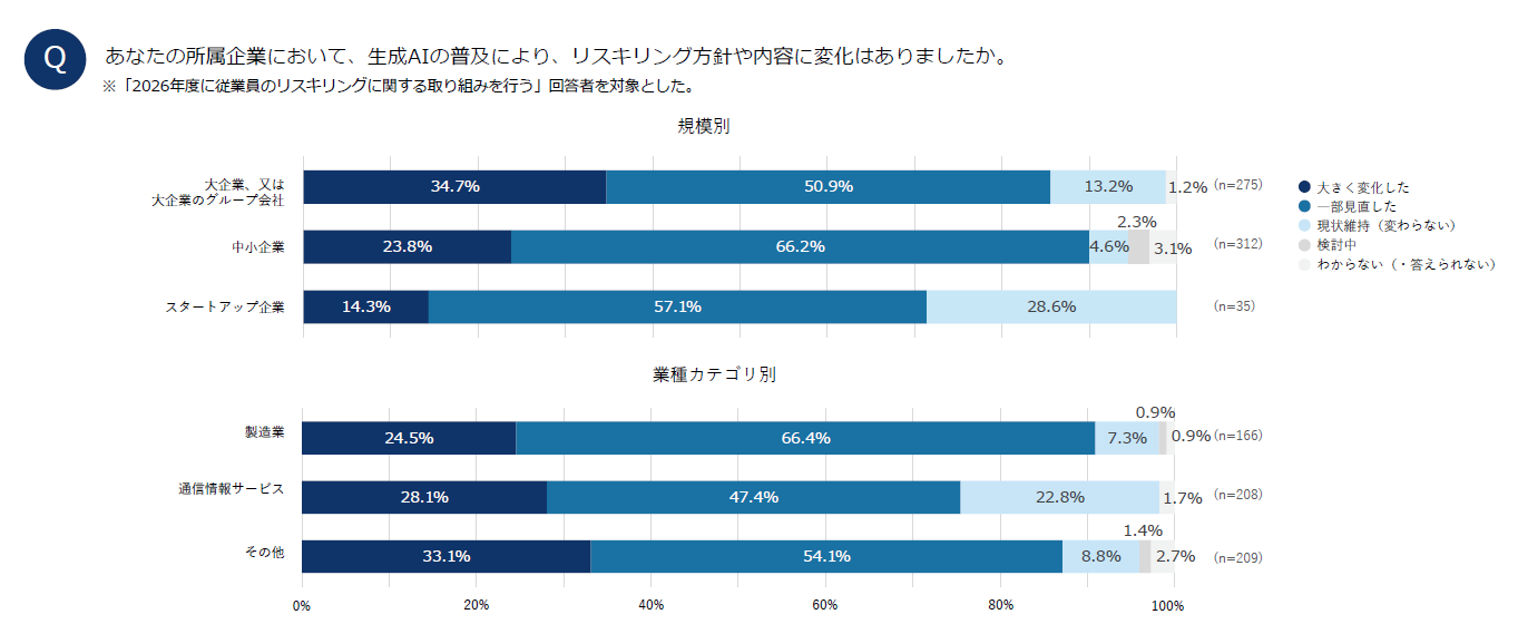 一方、スタートアップ企業では「現状維持(変わらない)」が28.6%と、大企業・大企業グループ会社の13.2%、中小企業の4.6%に比べて高く、企業規模によって対応状況に差が見られました。