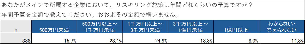 また、所属企業におけるリスキリング施策の年間予算を尋ねたところ、「1千万円以上~3千万円未満(24.9%)」が最も多く、次いで「500万円以上~1千万円未満(23.4%)」、「3千万円以上~1億円未満(13.3%)」が続きました。上位は数千万円規模の予算帯に集中しており、多くの企業が、まずは実行可能な規模で取り組みを進め、効果検証を行いながら段階的に投資を拡大していくという傾向が見て取れます。