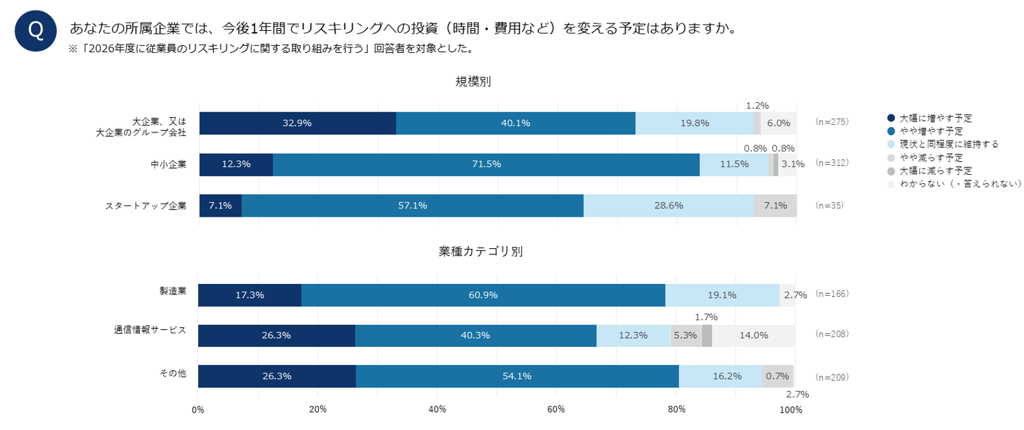 ・2026年度のリスキリングへの投資変化(全体・規模別・業種別)
