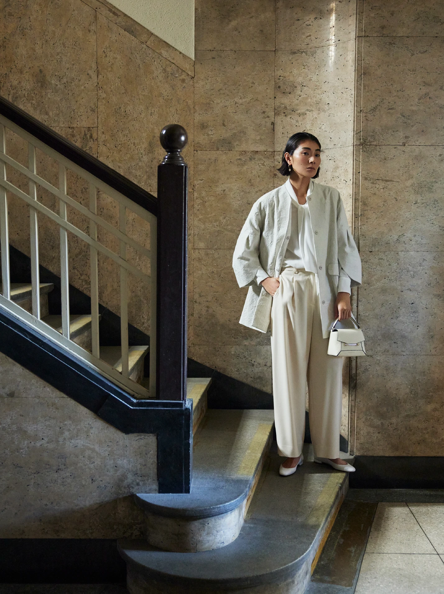 Jacket / ¥33,000 / Ballsey Blouse / ¥29,700 / TOMORROWLAND collection Pants / ¥19,800 / Ballsey