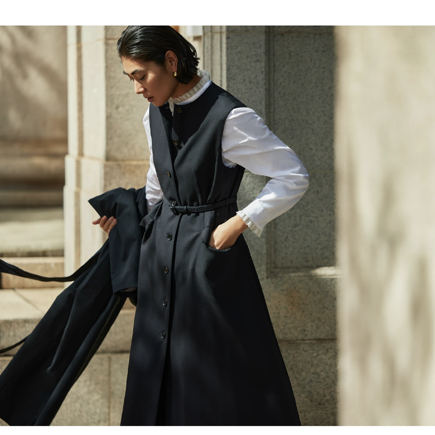 Jacket / ¥39,600 / Ballsey Vest / ¥35,200 / Ballsey Blouse / ¥33,000 / TOMORROWLAND collection Pants / ¥28,600 / Ballsey