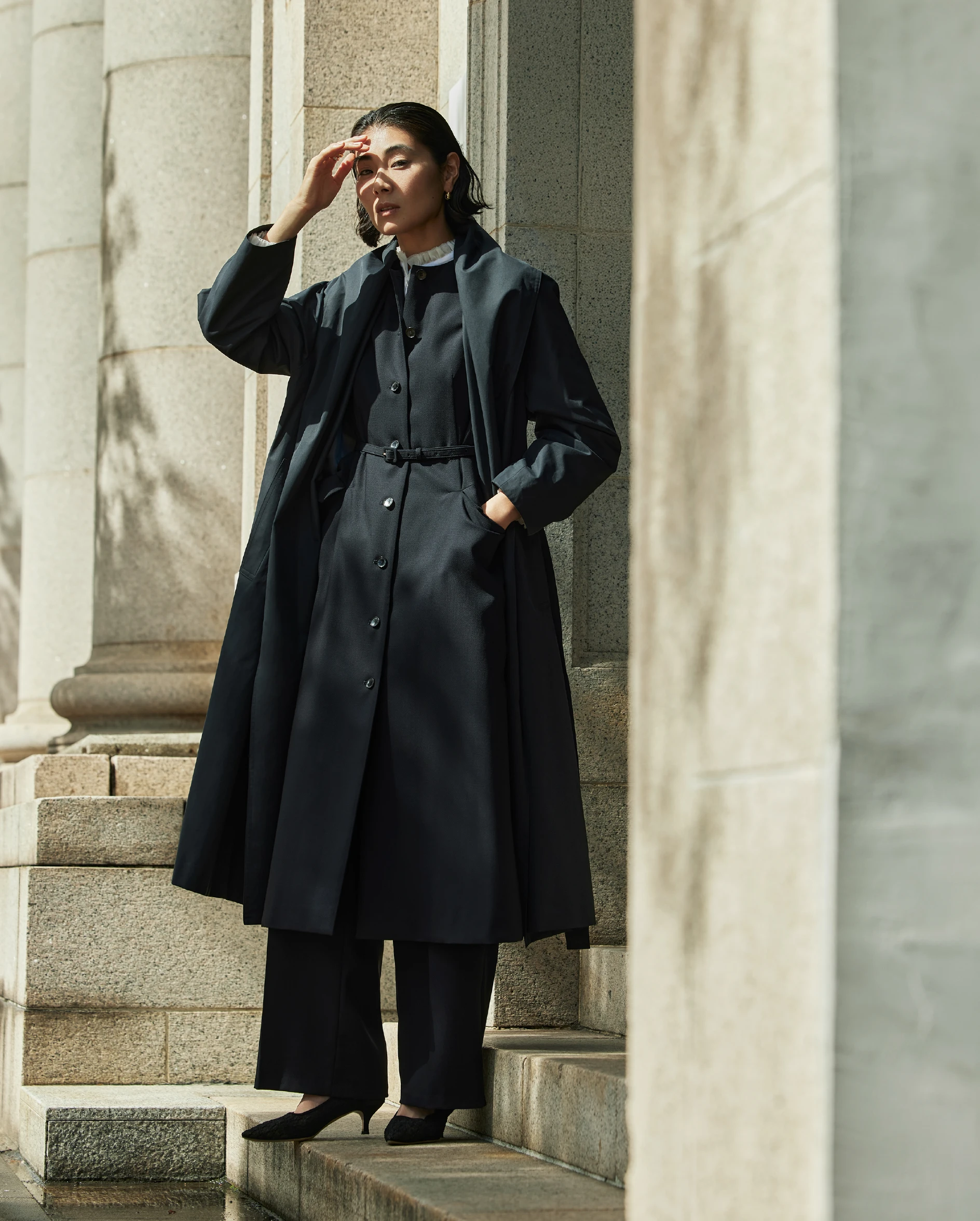 Coat / ¥69,300 / TOMORROWLAND collection Dress / ¥69,300 / TOMORROWLAND collection Blouse / ¥26,400 / TOMORROWLAND collection Pants / ¥29,700 / TOMORROWLAND collection