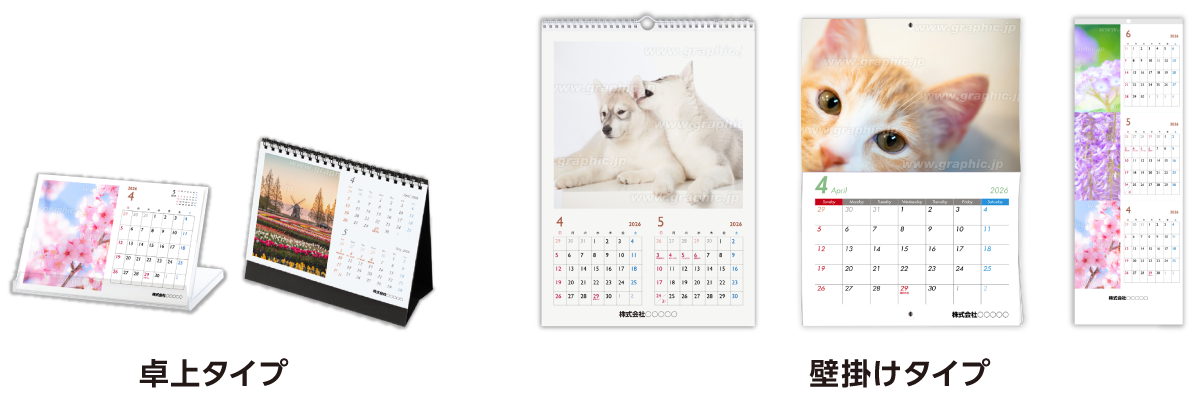 ノベルティや粗品として最適な、卓上カレンダーやポストカードサイズカレンダーなどのコンパクトなものから、写真を大きくレイアウトでき、プレゼントや記念品としておすすめな、中綴じカレンダーやハンガーカレンダーなど、ご利用用途に合わせてお好みのカレンダーをお選びください。