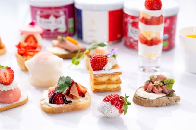 アフタヌーンティーの始まりには、ウェルカムドリンクとして「ストロベリー&ハニーフィズ」をご用意。苺の果実味に、はちみつのやさしい甘さと炭酸の爽やかさを重ね、最初の一杯として飲みやすい仕立てにしています。また、フリーフローのお飲み物にはフランスのオーガニックティーメゾンKUSMI TEA(クスミティー)をご用意。香りや味わいの異なる紅茶を、料理やスイーツに合わせてお楽しみいただけます。