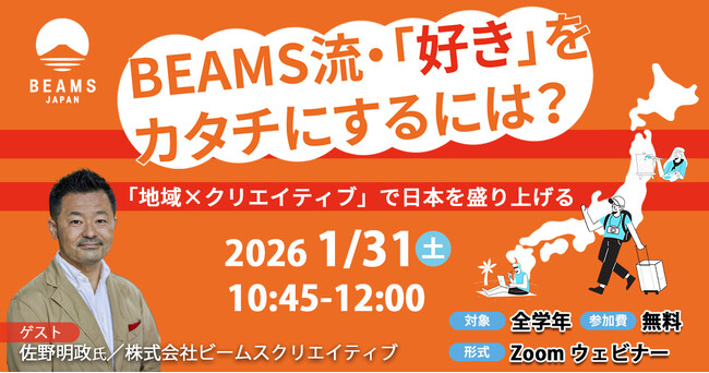 【イベント名】BEAMS流「好き」をカタチにするには?~地域×クリエイティブで日本を盛り上げる~【開催日時】2026年1月31日(土)10:45~12:00 ※申込み締切:1月30日(金)23:59
