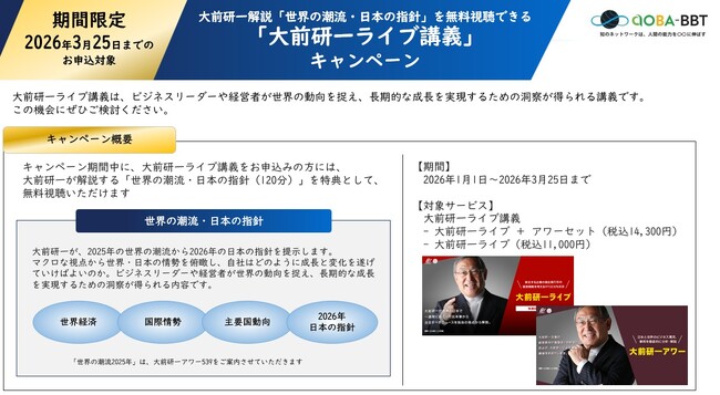 株式会社Aoba-BBT(本社:東京都千代田区、代表取締役社長:柴田巌)は、世界的な経営コンサルタントであり、BBT大学・大学院の学長でもある大前研一が、最新の情勢からビジネスの勝ち筋を導き出す映像講義「大前研一ライブ講義」において、期間限定の特別キャンペーンを実施いたします。