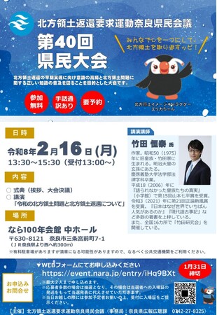 北方領土返還要求運動奈良県民会議では、北方領土返還の早期実現に向けて県民の意識を高めるため、令和8年2月16日(月)に第40回県民大会を開催します。申込は1月31日(土)まで。