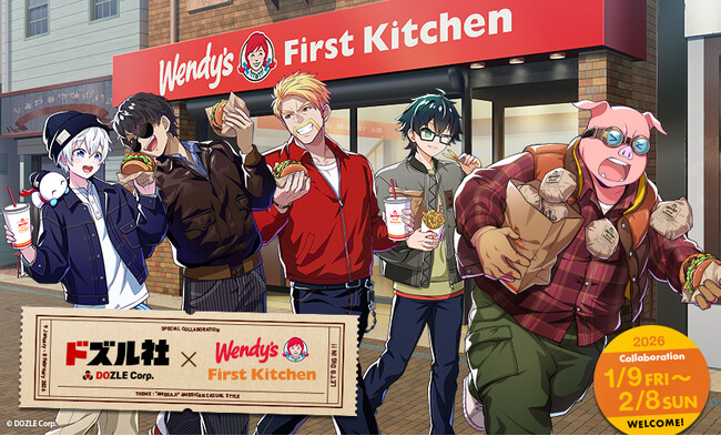 ウェンディーズ・ジャパン株式会社及び、ファーストキッチン株式会社(所在地:東京都新宿区、代表取締役:紫関修)は1月9日(金)より、ウェンディーズ・ ファーストキッチンとファーストキッチン(競馬場店を除く)で、ゲーム実況グループ『ドズル社』とのコラボキャンペーンを開催します。コラボを記念して、ドズル社をイメージした「ドズル社コラボ!マイルドカレー味」ポテトの販売、オリジナル描き下ろしイラストを使用した、「ステッカー」とお好きなフレーバーポテトMセット780円(税込)を2月8日(日)までの期間中、数量限定で販売します。数に限りがありますのでお早めにご来店ください。また、5店舗限定でコラボメニュー、コラボグッズなど盛りだくさんの内容を実施します。ぜひ『ドズル社』とのコラボレーションをお楽しみください。