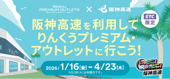 阪神高速道路株式会社(本社:大阪市北区、社長:上松英司)とりんくうプレミアム・アウトレット(所在地:大阪府泉佐野市、運営:三菱地所・サイモン株式会社)では、共同企画として「阪神高速を利用して『りんくうプレミアム・アウトレット』に行こう!」キャンペーンを、1月16日(金)から4月23日(木)まで実施いたします。