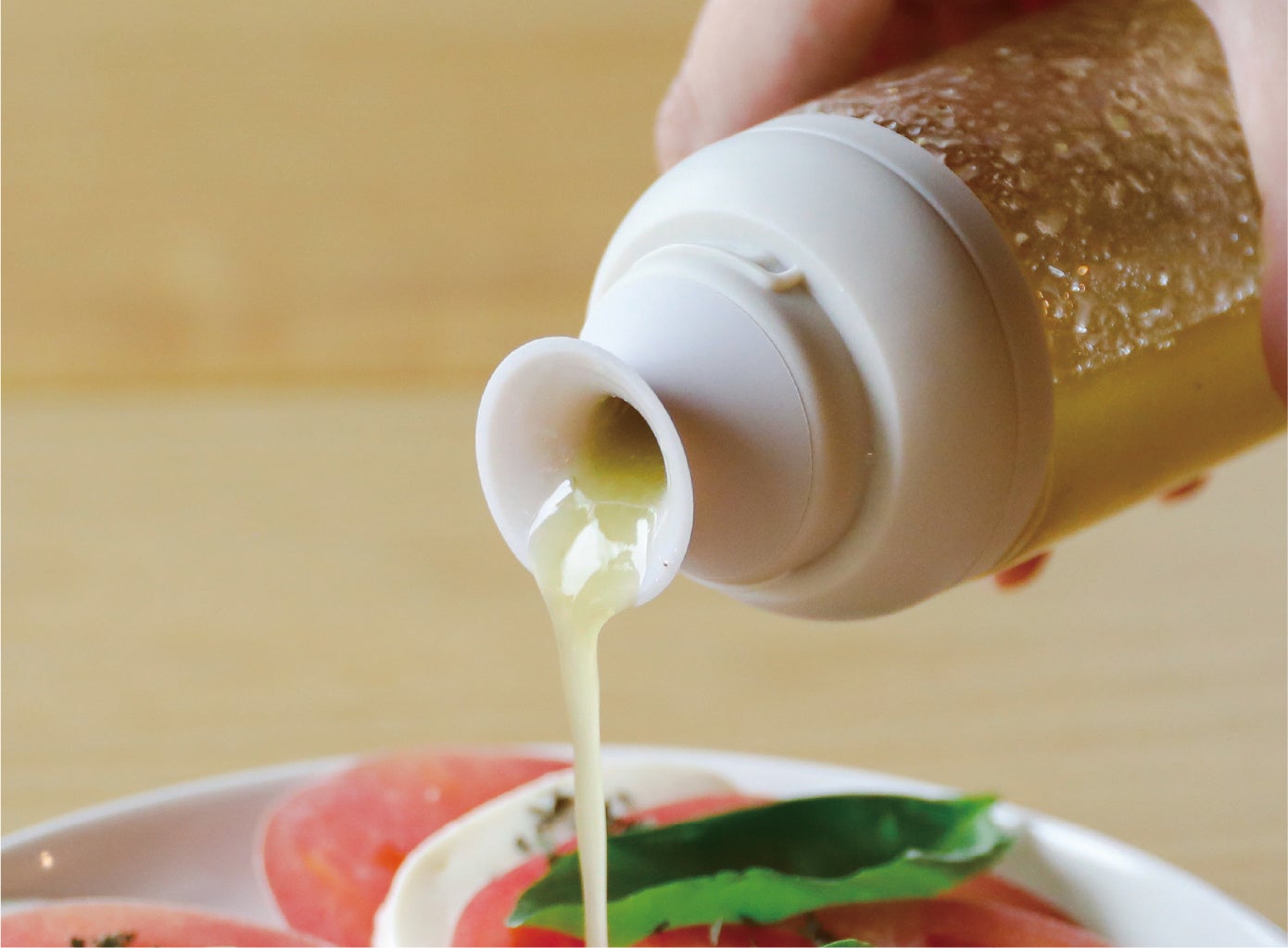 毎日の食卓で使うものだからこそ、使い心地にこだわりました。液垂れしにくい注ぎ口で、テーブルを汚すストレスから解放されます。サラダに均一にかけられるスムーズな注ぎ心地は、料理の仕上がりをワンランク上げてくれます。