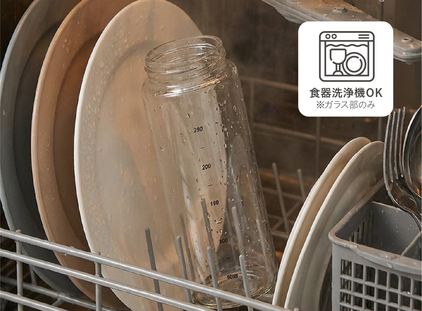 ガラス部分は食器洗浄機にも対応しており、お手入れが簡単です。