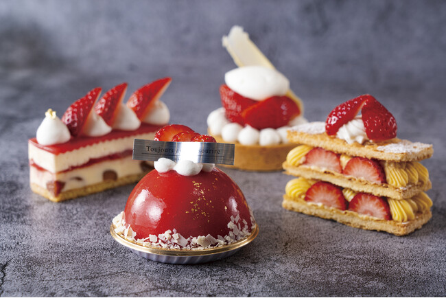手前:いちごのヨーグルトムース 奥:いちごのタルト 左:いちごのフロマージュ 右:いちごのミルフィーユ