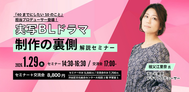 そこで今回のセミナーでは、テレビ東京のプロデューサーとして、TVドラマ「40までにしたい10のこと」などのヒット作を手がけた祖父江里奈様をお迎えし、ドラマ制作の流れや企画の立て方、原作選びといった基本的な話題から実際BL作品の映像化に関わられたご経験に基づくお話しまで、詳しくお伺いする予定です。