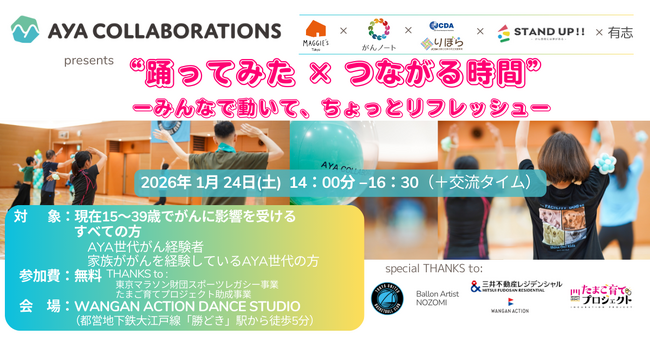 がんに影響を受ける方をサポートする認定NPO法人マギーズ東京(所在地:東京都江東区、共同代表理事:秋山正子・鈴木美穂、以下「マギーズ東京」)は、2026年1月24日(土)に、賛同する共同体、AYA COLLABORATIONS(マギーズ東京、NPO法人がんノート、NPO法人日本キャリア開発協会(JCDA)、若年性がん患者団体 STAND UP !!、有志)で、本気で楽しめるイベント「”踊ってみた×つながる時間”ーみんなで動いて、ちょっとリフレッシュー」を開催いたします。