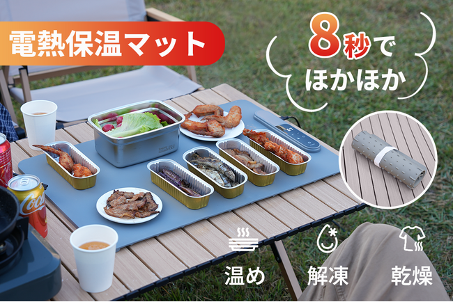 [画像5: https://prcdn.freetls.fastly.net/release_image/165948/59/165948-59-05e25c05ce80dba8c2c88767ce899aca-1200x1224.png?width=536&quality=85%2C75&format=jpeg&auto=webp&fit=bounds&bg-color=fff ]電源を入れてから、実用的な保温温度(約60℃)に到達するまで、わずか約8秒。キャンプで料理が冷めてしまった時、家庭で急いで朝食を温めたい時でも、「温まるのを待つ」というストレスから解放されます。