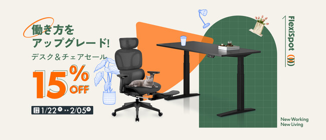 Flexispot Japan株式会社(本社:埼玉県入間郡、代表取締役:斉冰白、以下「FlexiSpot」)は、2026年1月22日(木)より、「デスク&チェアセール」を開催いたします。期間中は、人気の昇降デスクE7/E8およびオフィスチェアC7シリーズを対象に、15%OFFの特別価格でご提供いたします。