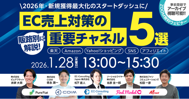 楽天市場・Amazon・Yahoo!ショッピング・SNS・アフィリエイトといった主要ECチャネルを横断的に解説する無料オンラインセミナー「販路別に解説!EC売上対策の重要チャネル5選」を、2026年1月28日(水)に開催いたします。