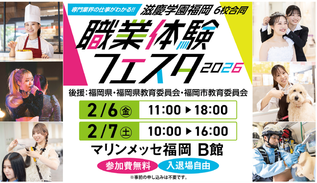 学校法人滋慶学園の福岡地区6校(福岡デザイン&テクノロジー専門学校、福岡スクールオブミュージック&ダンス専門学校、福岡医健スポーツ専門学校、福岡ECO動物海洋専門学校、福岡ベルエポック美容専門学校、福岡ホテル・ウェディング&製菓調理専門学校)は、2026年2月6日(金)・7日(土)の2日間、マリンメッセ福岡B館にて「職業体験フェスタ2026」を開催します。入場無料・入退場自由で、事前申込不要。高校生を中心に、中学生・小学生・保護者の方まで幅広く参加できる一般向けイベントです。