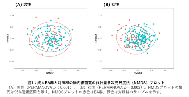 腸内細菌叢の多様性を比較するにあたり、β多様性※4をBray-Curtis指数に基づく非計量多次元尺度法(NMDS)※5のプロットにより可視化し、PERMANOVA※6の検定を実施したところ、男女ともにβ多様性に有意差が認められました(図1)。これは、成人BA群と対照群では腸内細菌叢の構成に違いがあることを示しています。