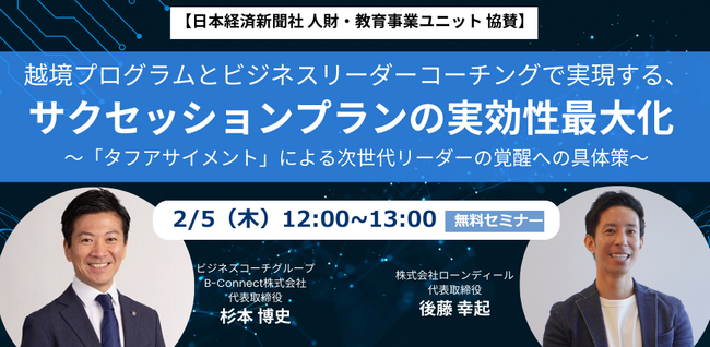 ビジネスコーチ株式会社(本社:東京都港区、代表取締役社長:細川 馨、東証グロース:9562)の子会社であるB-Connect株式会社(本社:東京都港区、代表取締役社長:杉本 博史、以下当社)は、2月5日(木)に、株式会社ローンディール 代表取締役 後藤幸起氏をお招きし特別セミナーを開催いたします。両社のソリューションを組み合わせることで、サクセッションプランの実効性を最大化させる具体策をお伝えいたします。