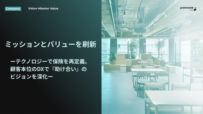 株式会社justInCaseTechnologiesは、2025年12月、事業の成長に合わせミッションおよびバリューを刷新したことをお知らせいたします。新ミッションは「テクノロジーで顧客本位の業務運営を進化させる」です。保険はその必要性や比較の難しさ、価格(保険料)の透明性など顧客との情報格差が存在する商品です。私たちはテクノロジーでこの構造的な課題を解消し、顧客利益を最優先とする業務運営を通じて、助ける喜びと助けられる安心が広がる社会を目指します。