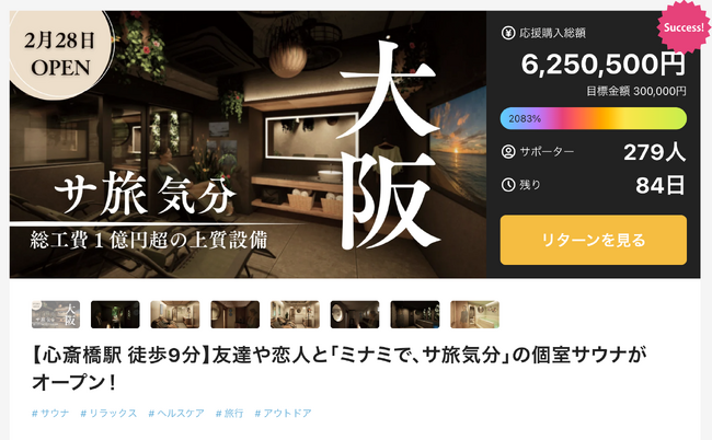 2026年2月28日のオープンに先立ち、2026年2月2日よりMakuakeで支援者募集を開始。開始48時間で625万円を達成し、関西サウナ施設プロジェクト歴代1位を獲得しました。