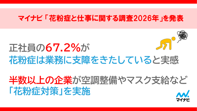 株式会社マイナビ(本社:東京都千代田区、代表取締役 社長執行役員:粟井俊介)は、全国の企業、個人を対象に実施した「花粉症と仕事に関する調査2026年」を発表しました。本調査は、花粉症が転職活動や仕事に与える影響、また企業の花粉症対策の実態を把握することを目的に実施しました。今回が2回目の調査となります。