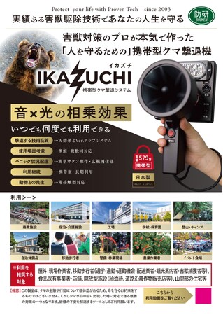 その第1弾として、音と光でクマを撃退する携帯型熊撃退器「イカズチ(IKAZUCHI)」を2026年2月末に発売いたします。本製品は、同社が長年の害獣対策現場で培ってきた独自技術体系 「防研TECH」に基づき開発されました。