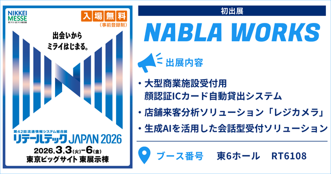 ナブラワークス株式会社(本社:東京都港区、代表取締役:本島 昌幸) は、2026年3月3日(火)~3月6日(金)の4日間、東京ビッグサイトで開催される「リテールテックJAPAN 2026」に出展することをお知らせいたします。