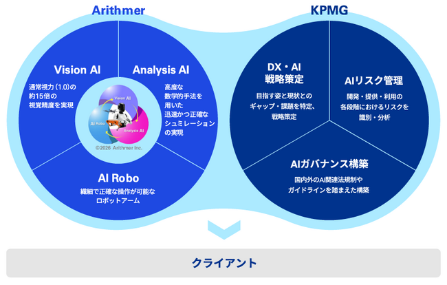 KPMGジャパンは、各種業界向けのDX戦略策定および、AIリスク管理やガバナンス構築にむけた助言業務から得たノウハウ・知見を活かし、各種業界のDX推進におけるAI活用戦略から実装、ガバナンス構築のアドバイザリーサービスの提供をしています。またArithmer社は、AIソリューションプロバイダーであり、マルチAIエージェントやフィジカルAIにおける高い技術力と豊富な実績を有する企業です。KPMGジャパンはArithmer社の知見、強みを最大限に活かしたアドバイザリーサービスを提供することで、AIエージェント技術等を活用した企業の業務改善、変革を支援します。