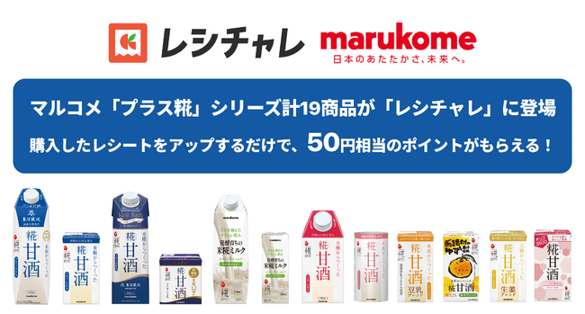 節約アプリ「レシチャレ」は、2026年2月18日(水)~3月31日(火)の期間、マルコメ株式会社の「プラス糀 糀甘酒」シリーズや「プラス糀 米糀ミルク」など対象の計19商品のうち、いずれかを購入しレシートをアップロードされた方を対象に、50円相当のポイントを付与するキャンペーンを実施します。