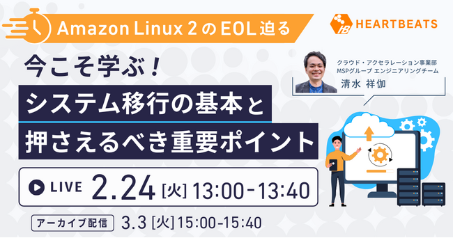 サーバー監視・保守・運用のフルマネージドサービスを提供する株式会社ハートビーツ(本社:東京都新宿区、代表取締役:藤崎 正範)は、2026年2月24日(火)に「【Amazon Linux 2 のEOL迫る】今こそ学ぶ!システム移行の基本と押さえるべき重要ポイント」と題した無料ウェビナーを開催します。
